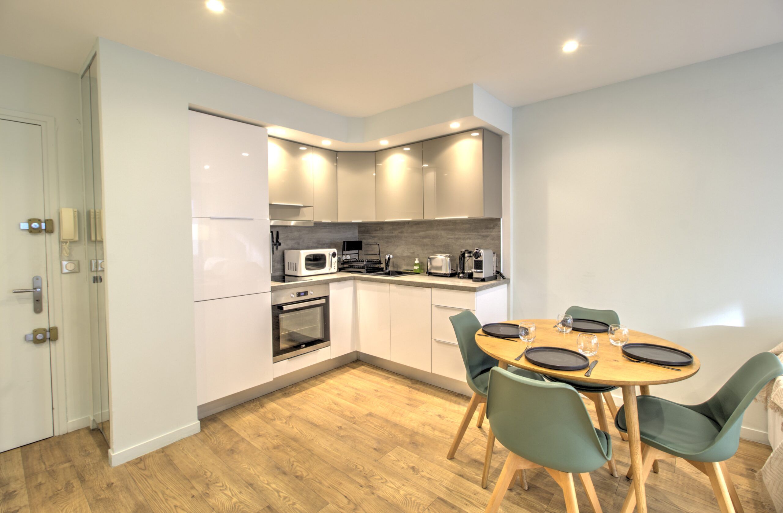 - 1 cuisine tout équipée : réfrigérateur avec congélateur, bouilloire, Nespresso, grille pain, micro onde, four, plaques vitro, lave vaisselle