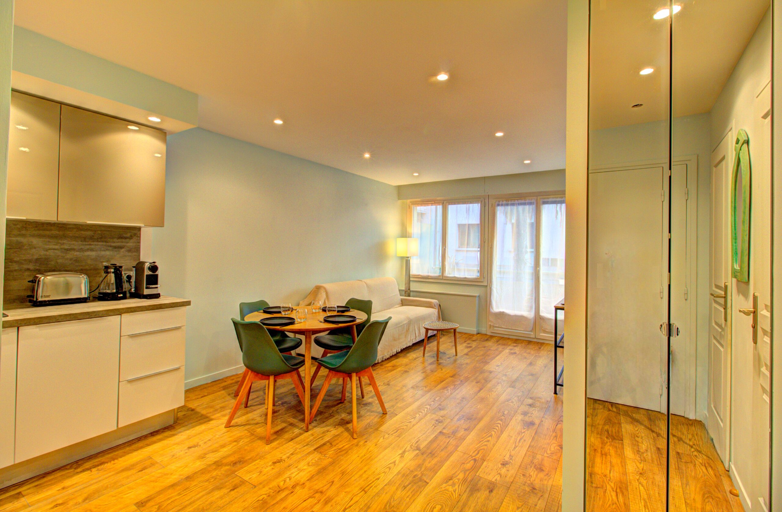 Un appartement entièrement récemment rénové en plein centre ville. Tout équipé, climatisé, au 1er étage avec ascenseur. Raffiné, élégant et bénéficiant d’un grand nombre d’équipement, il bénéficie d’une terrasse pour déjeuner à deux. 2 lits simples dans la chambre (possibilité de faire un lit double) et un canapé convertible dans le salon.