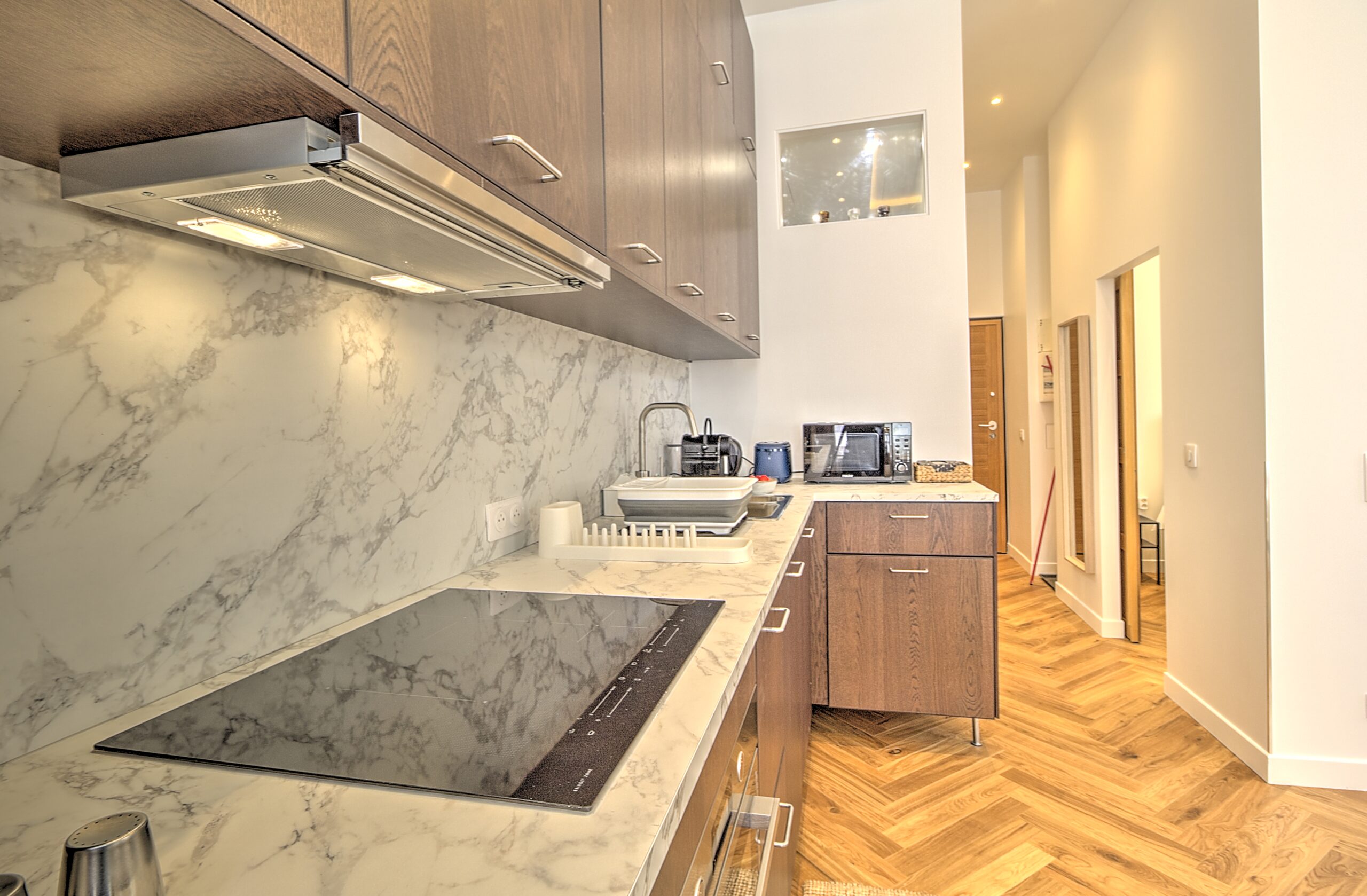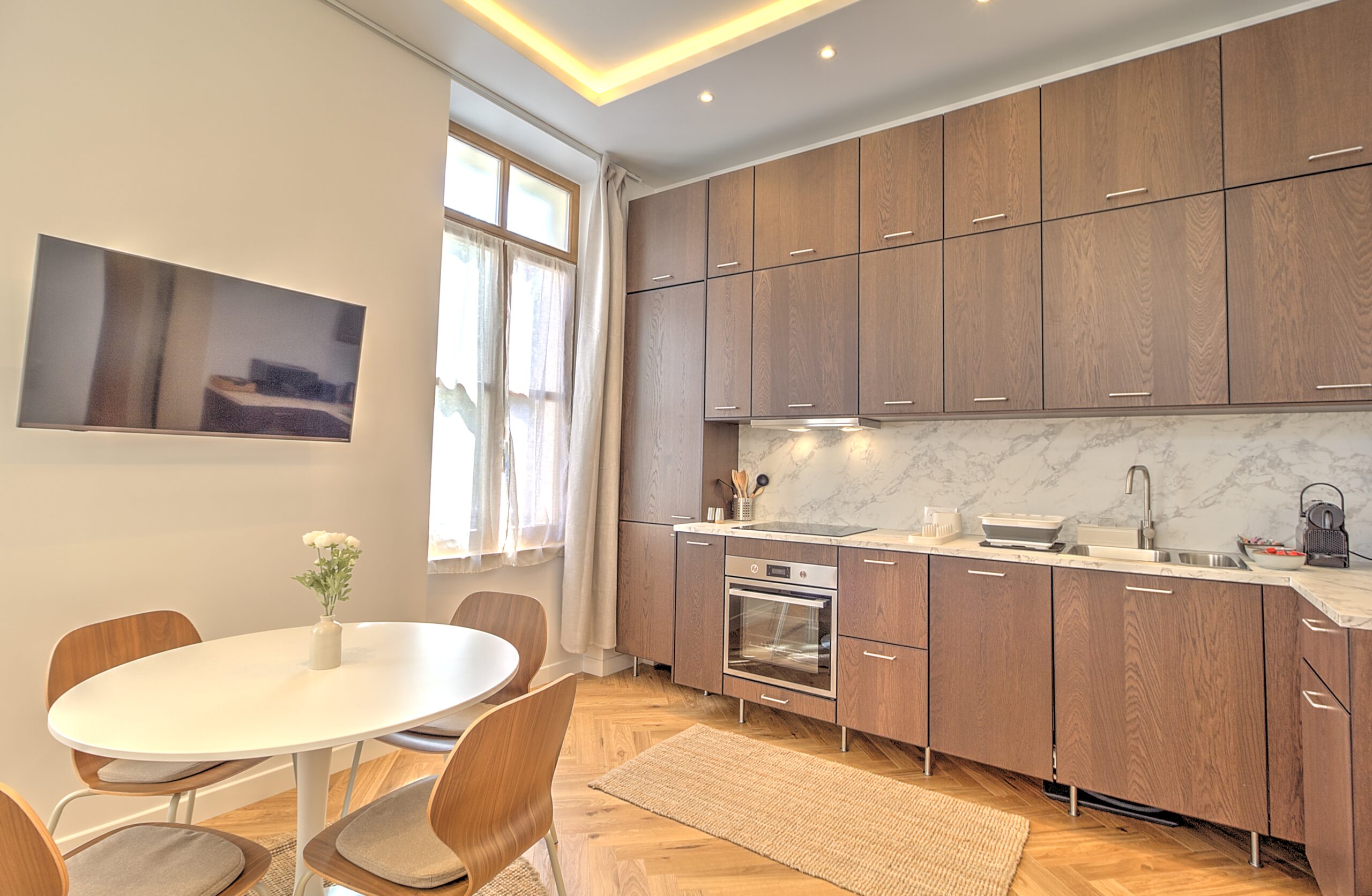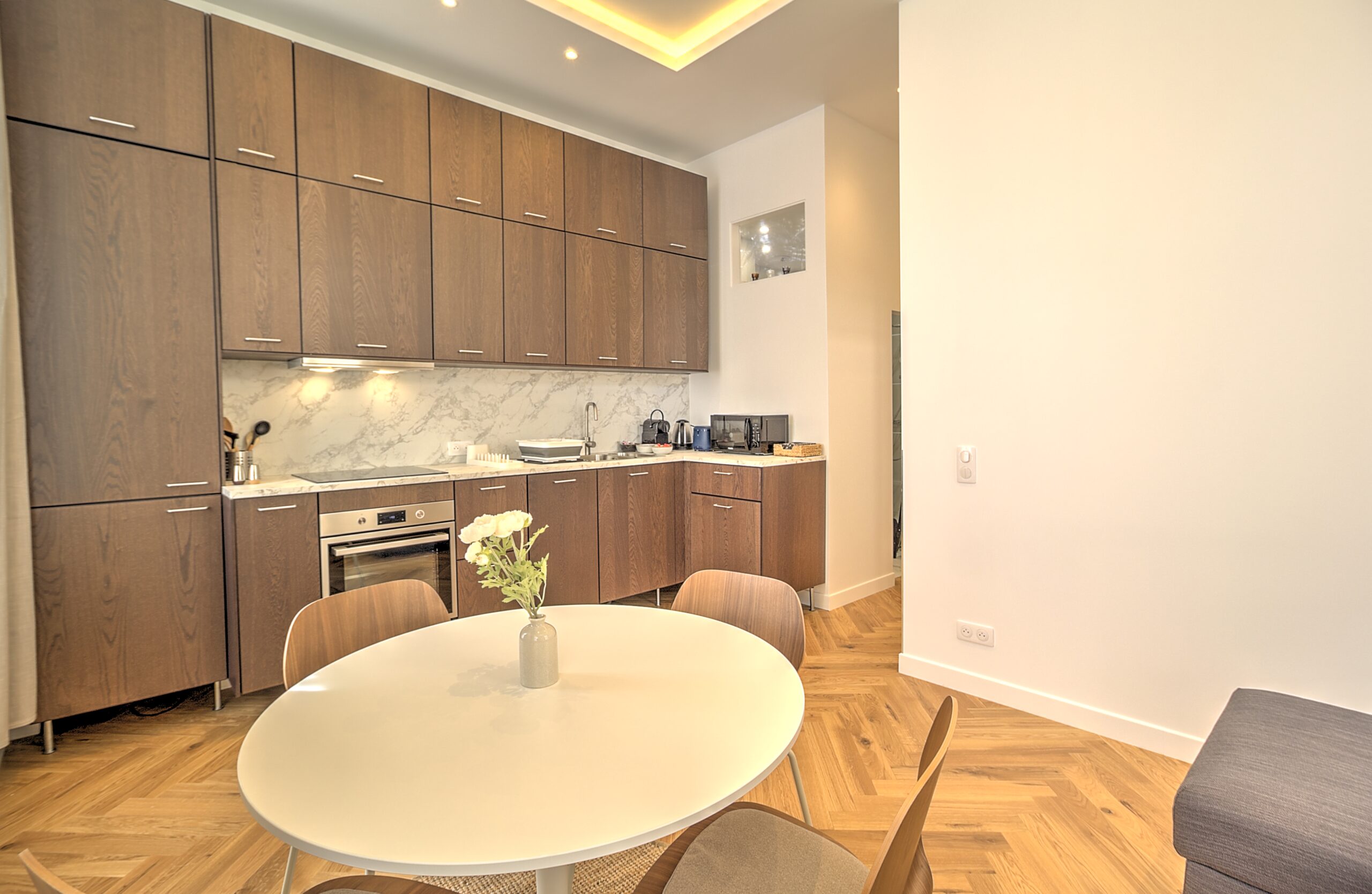 - Cuisine : réfrigérateur avec congélateur, bouilloire, Nespresso, grille pain, micro onde, four, plaques vitro, lave vaisselle
