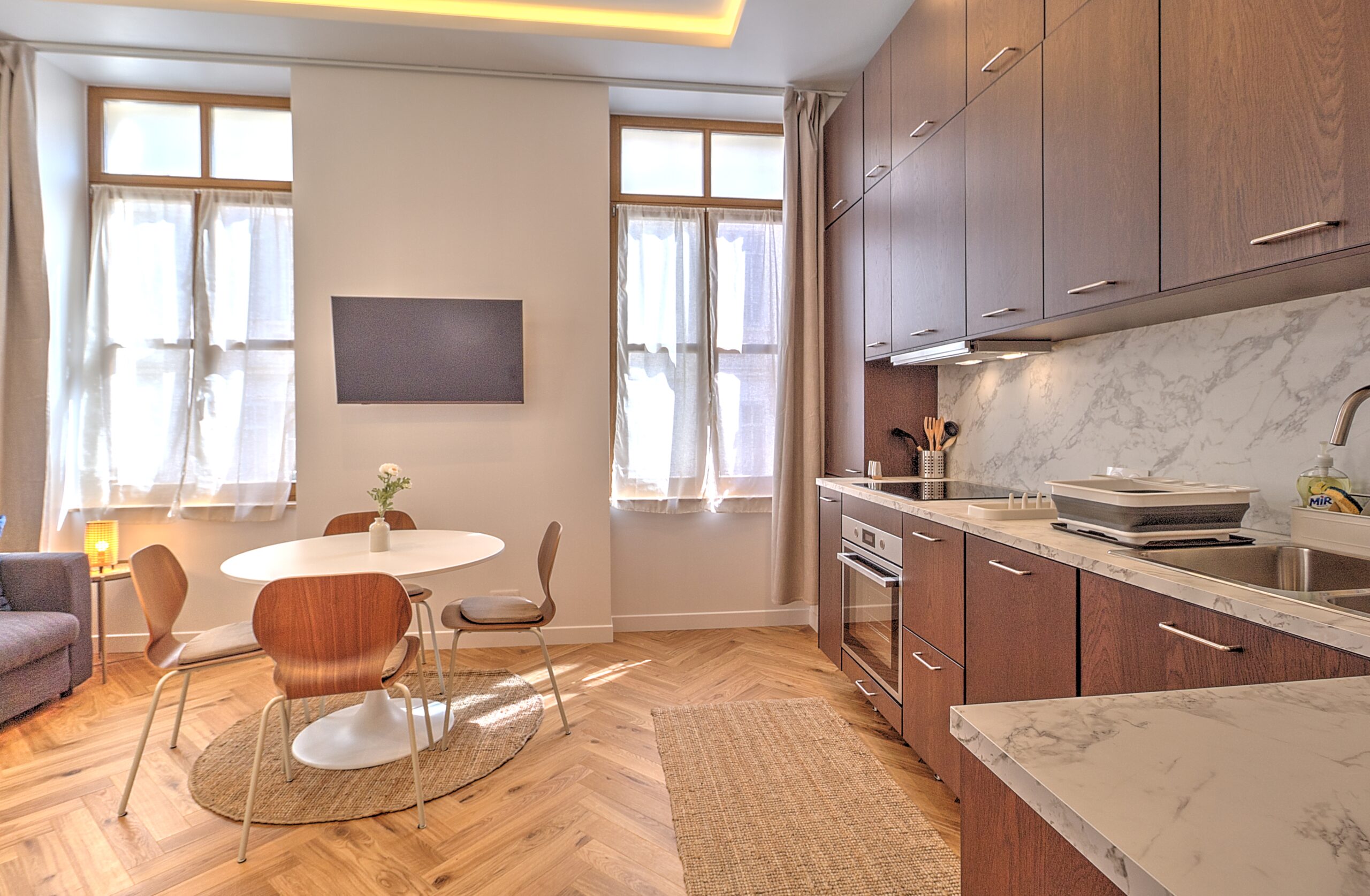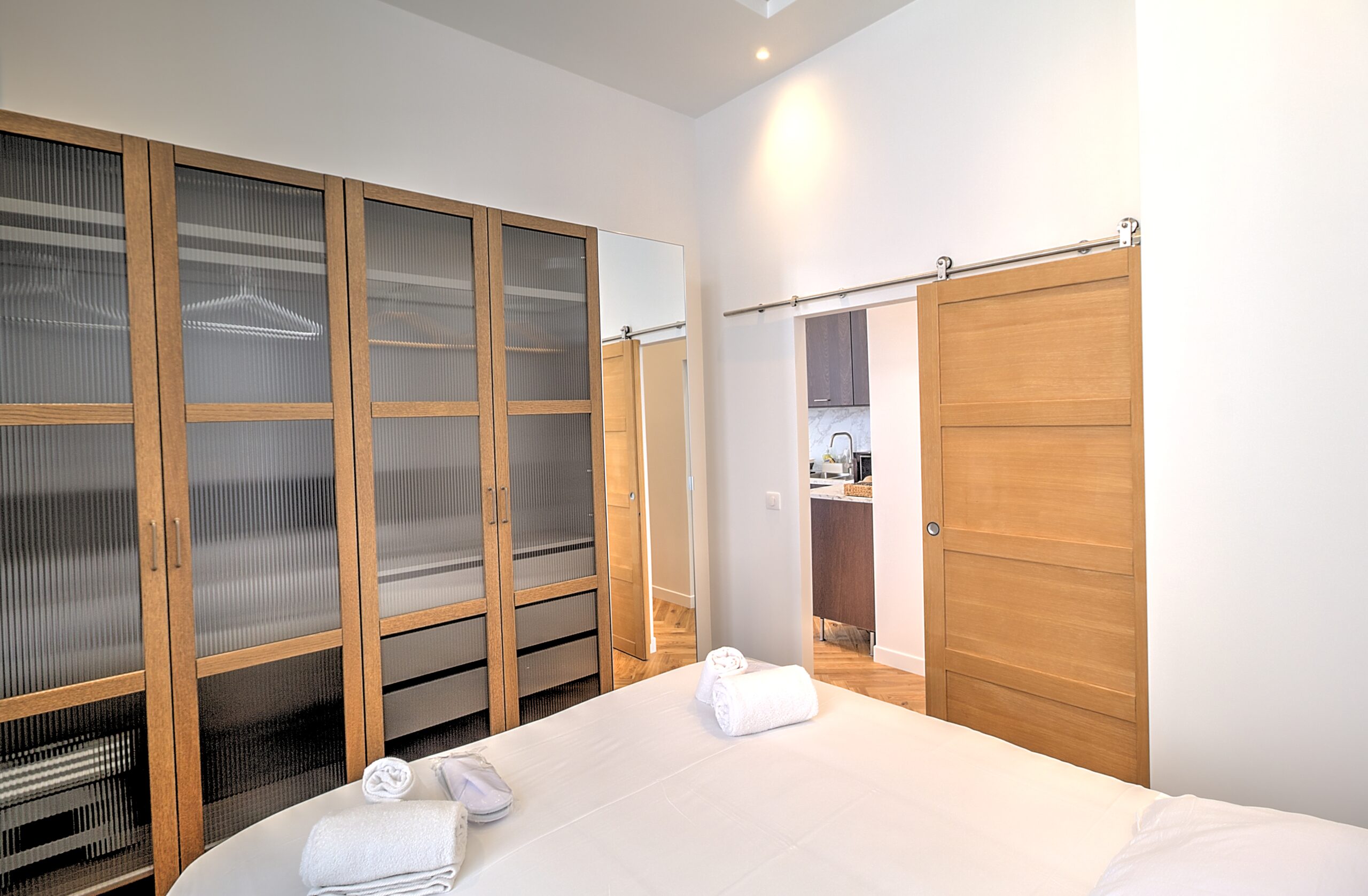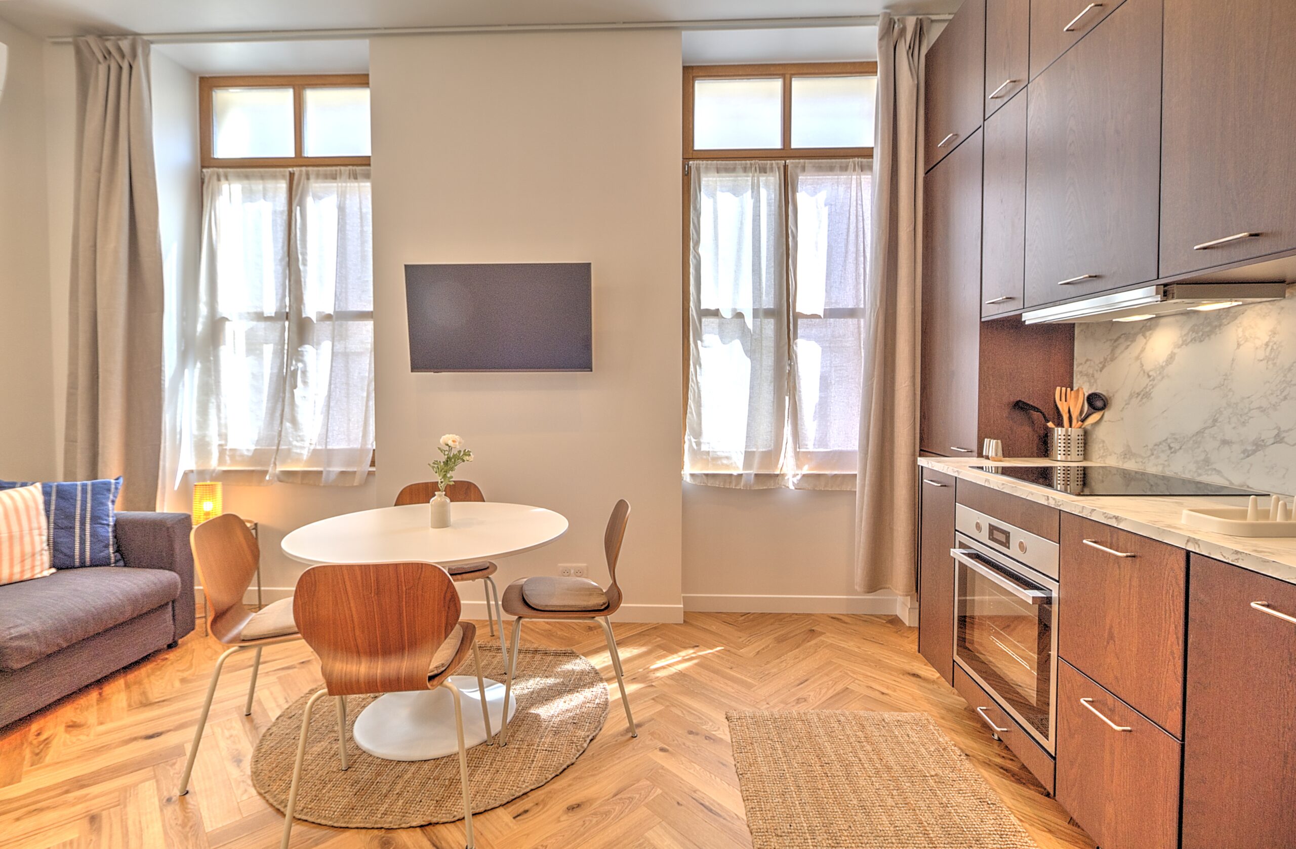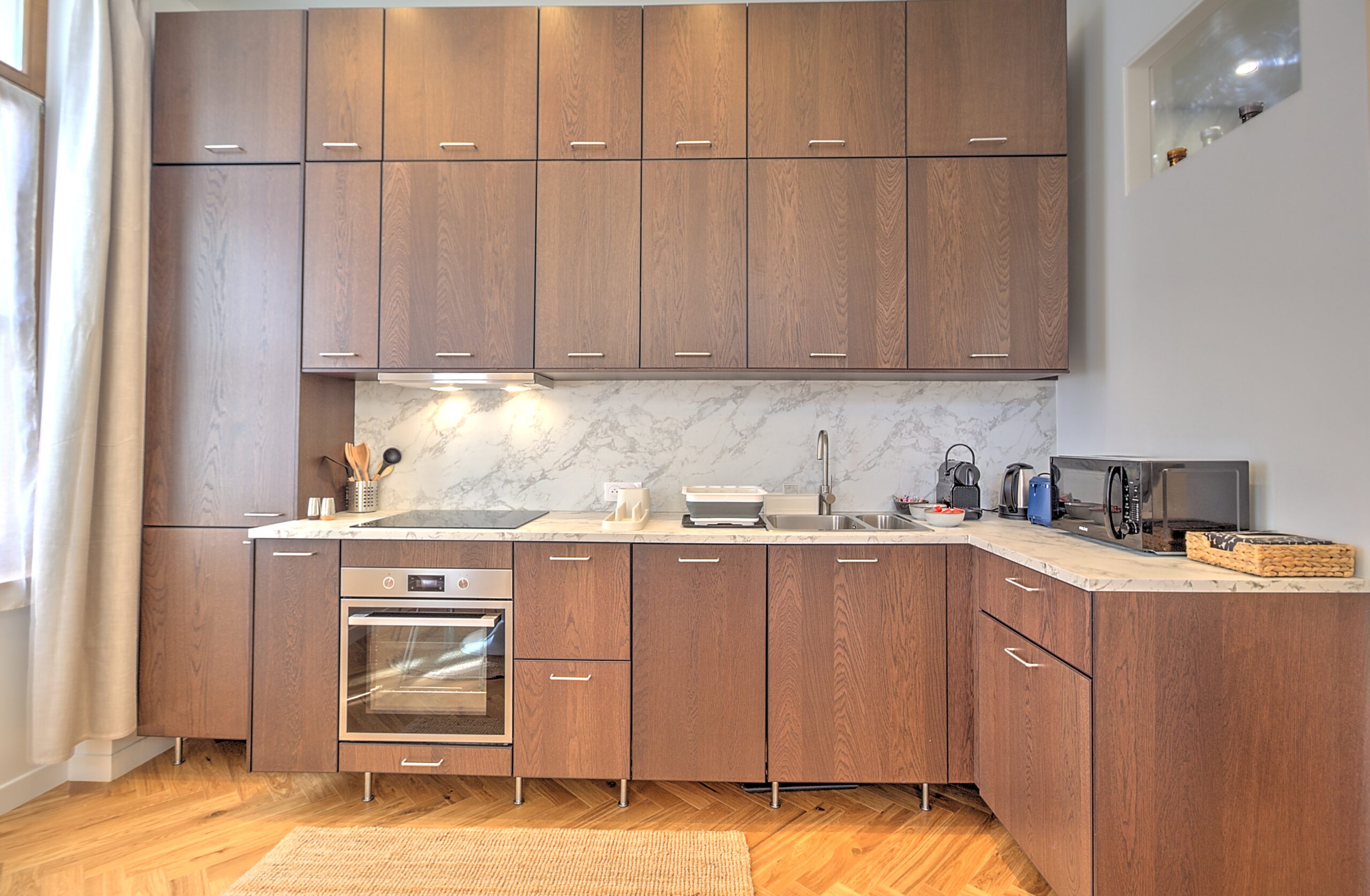 - Cuisine : réfrigérateur avec congélateur, bouilloire, Nespresso, grille pain, micro onde, four, plaques vitro, lave vaisselle