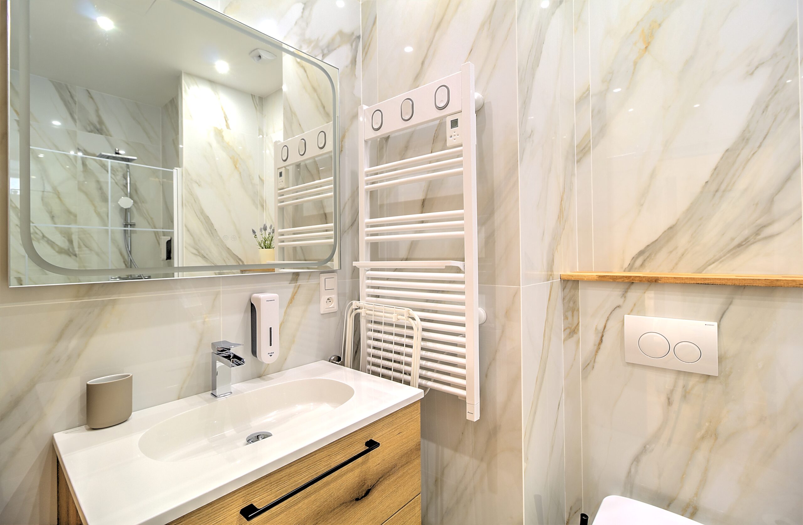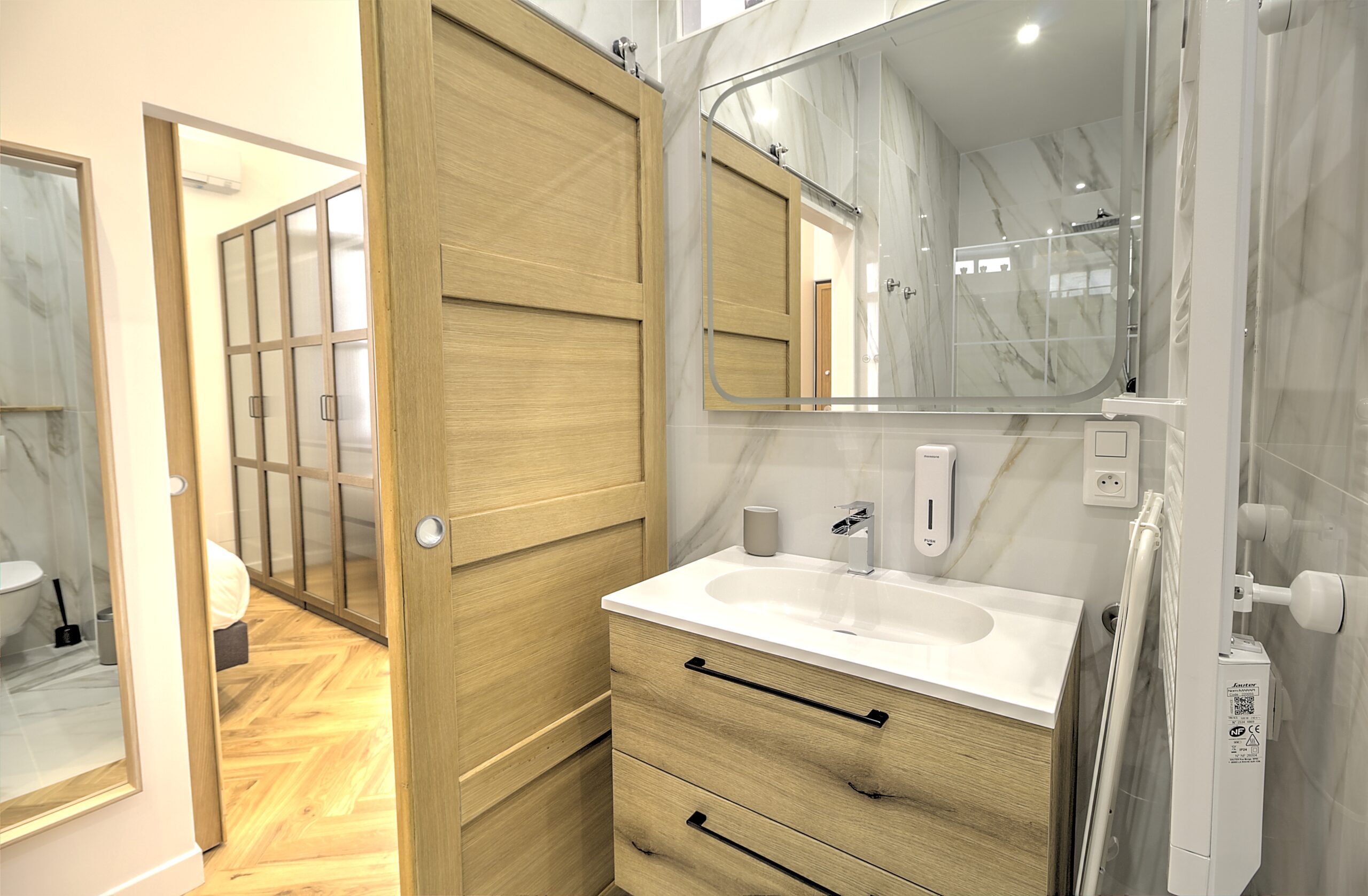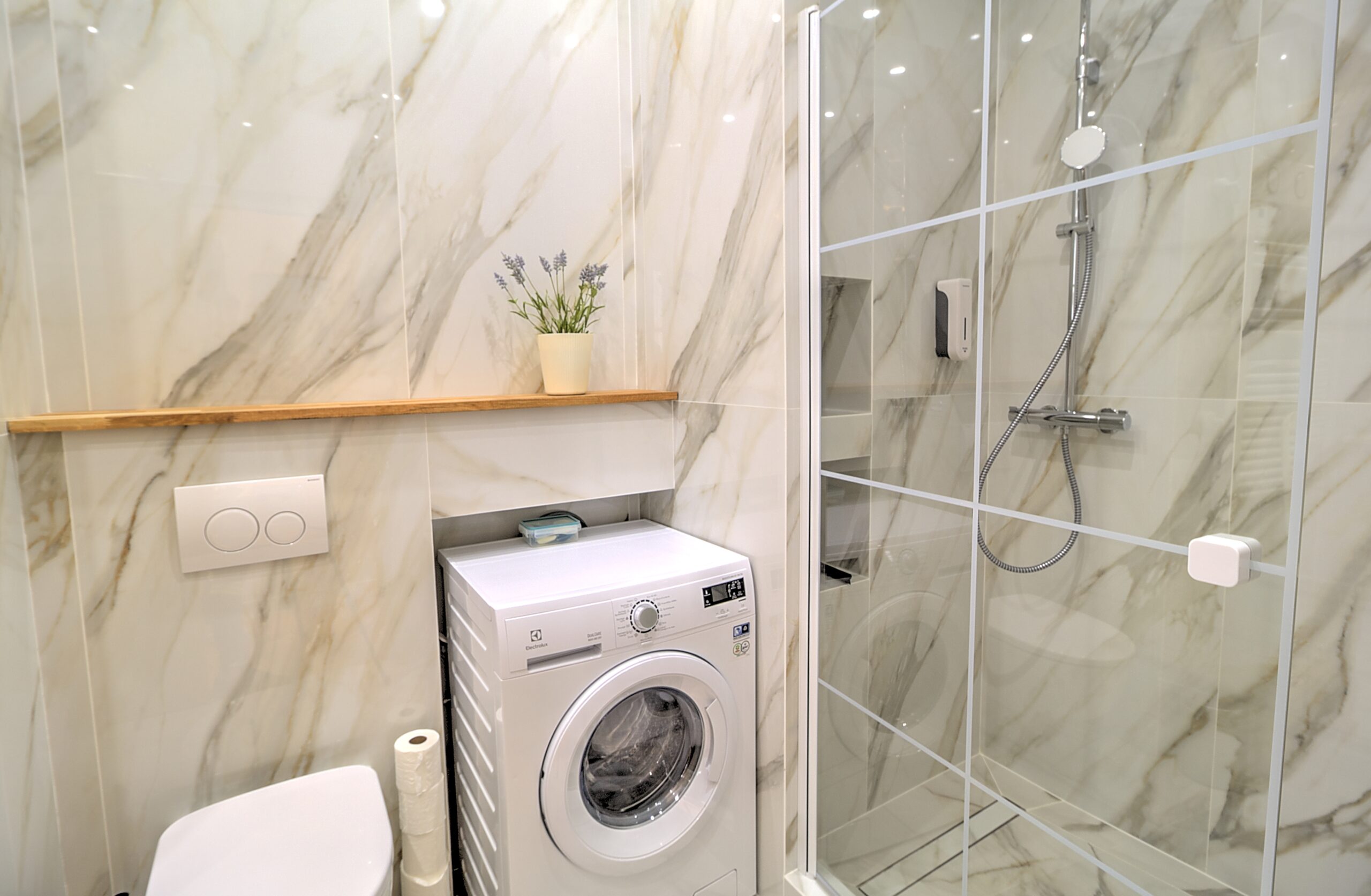 - 1 salle des bain avec douche et toilette et lave linge séchant